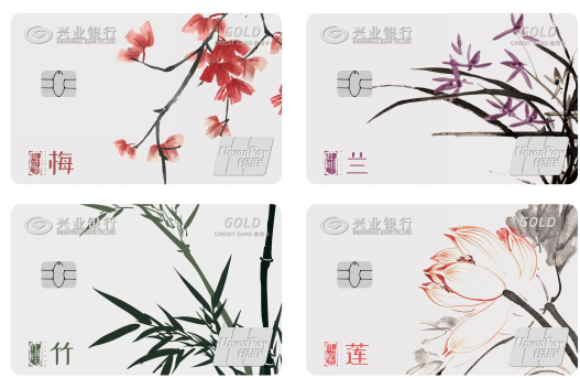 其中,興業銀行中國風系列銀行卡四張,以梅蘭竹蓮等在中國具有高潔典雅的植物為主要元素,色彩運用清新,畫面風格簡潔大方,讓人眼前一亮。