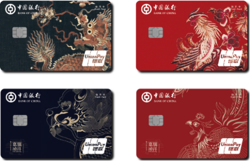 中央銀行故宮祥瑞系列銀行卡四張,分別以獬豸、麒麟、鳳凰等上古神話中的祥瑞神獸形象為主要元素,色彩以黑色、大紅色為主,畫面莊重而不呆板,整體風格大氣磅礴。